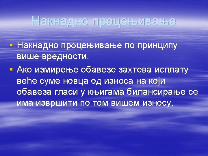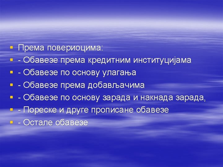 § Kako se inicijalno i nakndano vrednuju obaveze po osnovu isporuke proizvoda i usluga? § Objasnite način nastanka i način likvidacije pasivnih vremenskih razgraničenja. § Na koji način se dobitak iz bilans uspjeha može prenijeti u bilans stanja? §