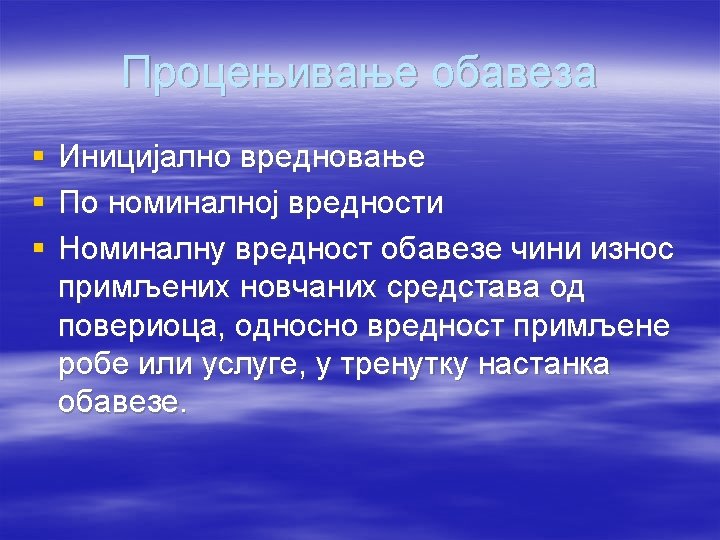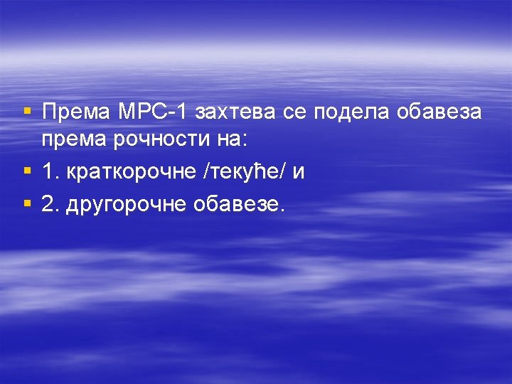 § Koji razlozi dovode do nastanka obaveze? § Raščlanite obaveze pema načinu sticanja, prema poveriocima i prema sigurnosti. § Koji kriterijum za rašlanjavanje obaveza se zahteva prema MRS 1 - Prezentacije finansijskih izvještaja. Objasnite zašto? § Navedite koje se obaveze smatraju kratkoročnim. § Kako se vrši početno priznavanje obaveza, a kako naknadno? § Objasnite princip više vrednosti kod naknadnog priznavanja obaveza.