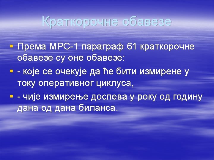 § Koji kriterijumi treba da budu ispunjeni da bi se neka obaveza klasifikovala kao tekuća: § a) očekuje se da će biti izmirena tokom normalnog poslovnog ciklusa pravnog lica § B) stvara se prvenstveno u procesu trgovanja § C) dospijeva za izmirenje u okviru perioda do dvanaest mjeseci nakon datuma bilansa § D) pravno lice nema bezuslovno pravo odgoditi izmirenje obaveze za najmanje dvanaest mjeseci nakon datuma bilansa § samo ako su ispunjeni svi kriteriji navedeni pod a) do d) § ako je ispunjen bilo koji od kriterija navedenih od a) do d)