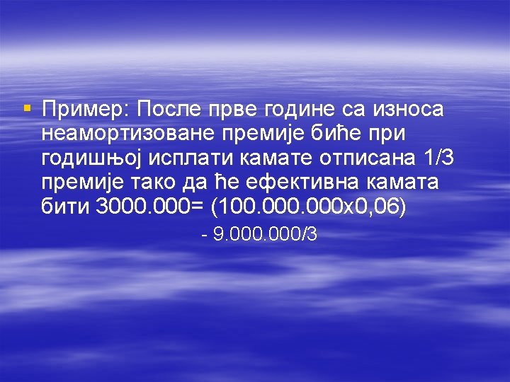 § Primer: Preduzeće koje se bavi proizvodnjom i prodajom digitalnih fotoaparata sa garancijom od godinu dana treba da proceni visinu rezervisanja. § Ako bi svi aparati imali malu grešku troškovi popravki bi iznosili 50. 000. -, ako bi svi prodati aparati imali značajnu grešku trošak popravki bi bio 150. 000. § Iskustvo i buduća očekivanja pokazuju da će u 80% slučajeva aparati biti potpuno ispravni, u 15% slučajeva javiće se manji kvar, a samo u 5% slučajeva biće većih kvarova. § 80% nikakvih troškova + 15% od 50. 000 + 5% od 150. 000= 15. 000. -