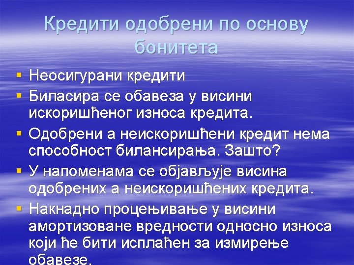 Rezervisanje za restrukturiranje § Mora zadovoljiti sve predvidjene kriterijume za formiranje rezervisanje: § Stvarna obaveza da se izvrši restrukturiranje postoji ako preduzeće raspolaže detaljnim formalnim planom za restrukturiranje i § ako je izazvalo opravdano očekivanje medju onima koji su pogodjeni, da će sprovesti restrukturiranje počevši da implentira plan ili objavljivanjem njegovih glavnih karakteristika onima na koje on utiče.