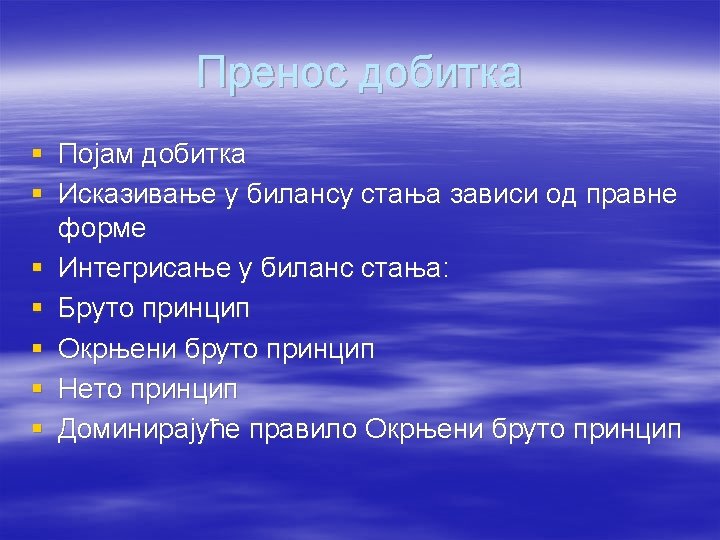 . Integrisanje dobitka u bilans stanja prema okrnjenom bruto principu znači: § da se u bilans stanja integriše utvrđeni dobitak iz bilansa uspeha umanjen za porez na dobitak i dividendu § da se u bilans stanja integriše samo dobitak koji je ostao neraspoređen § da se u bilans stanja integriše dobitak iz bilansa uspeha umanjen za porez na dobitak, dividende i rezerve