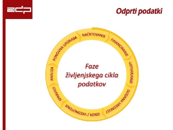 Podatki o projektu ‘ODPRTI PODATKI’ • Naslov: » Odprti podatki - Priprava akcijskega načrta za vzpostavitev sistema odprtega dostopa do podatkov iz javno financiranih raziskav v Sloveniji «. • Šifra: projekt CRP s šifro V 5 -1018 • Proračun: 60 k • Trajanje: 2010 -13 • Izvajalec: ADP