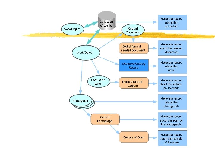 Metadata as part of a Resource Description Community z A resource description community is characterized by common semantic, structural and syntactic conventions used for the exchange of information. z Through the use of detailed standards MARC & AACR 2 the library community promotes interoperability. z While the art community formed the Art & Architecture Thesaurus (AAT) and the Categories for the Description of Works of Art (CDWA), specifically the art museum community can use these in addition to metadata to share resources.