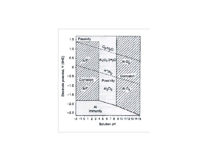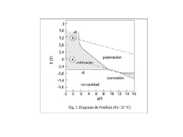 Diagramas de Pourbaix Os potenciais de redução de algumas reacções dependem do p. H. Como exemplo temos a redução do ião hidrogénio: 2 H+ + 2 e- H 2(g) Aplicando a equação de Nernst, a 25 °C, obtemos: ou E = E° + 0. 059× log [H+] E = − 0. 059 p. H Os diagramas de Pourbaix representam num diagrama potencialp. H os vários equilíbrios químicos que estão envolvidos na corrosão de um metal, e mostram as zonas de imunidade, passividade ou corrosão de um metal. Estes diagramas são muito úteis pois permitem prever o comportamento de um metal, quando sujeito a um determinado p. H e potencial aplicado.