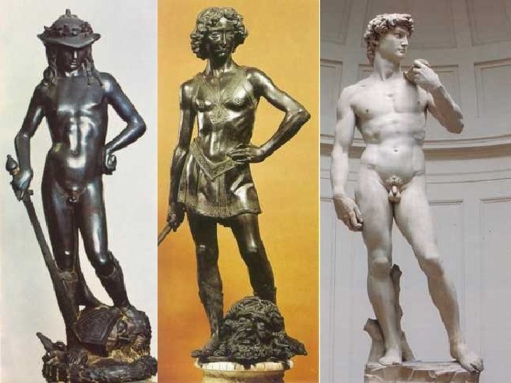 "David” (1502 -1504) Obra con la que se consagra como el superador de toda la estatuaria antigua. n Recibió el encargo de tallar un bloque de mármol de extraordinaria altura (4, 34 m. ) y muy estrecho, una pieza que había permanecido durante 40 años en el patio de obras de la catedral. n