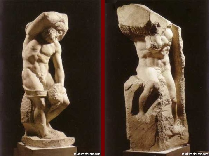 En ellas se aprecia perfectamente otra de las características fundamentales de la escultura miguelangelesca, su técnica "per forza di levare": las esculturas emergen de la materia informe, son concebidas como figuras encerradas en el bloque el escultor debe liberar.