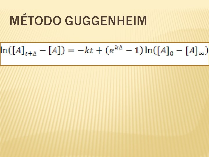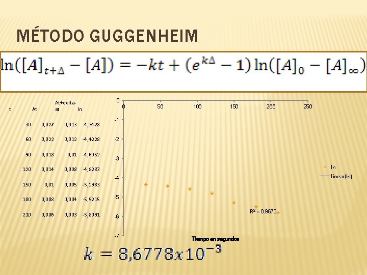 MÉTODO GUGGENHEIM t At+deltaln at At 30 0, 027 0, 013 -4, 3428 60 0, 022 0, 012 -4, 4228 90 0, 018 0, 01 -4, 6052 120 0, 014 0, 008 -4, 8283 0 0 50 100 150 200 250 -1 -2 -3 ln Linear(ln) -4 150 0, 01 0, 005 -5, 2983 180 0, 008 0, 004 -5, 5215 -5 210 0, 006 0, 003 -5, 8091 -6 -7 R 2 = 0. 9673 Tíempo en segundos
