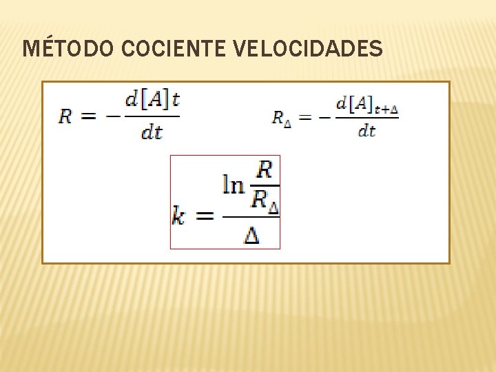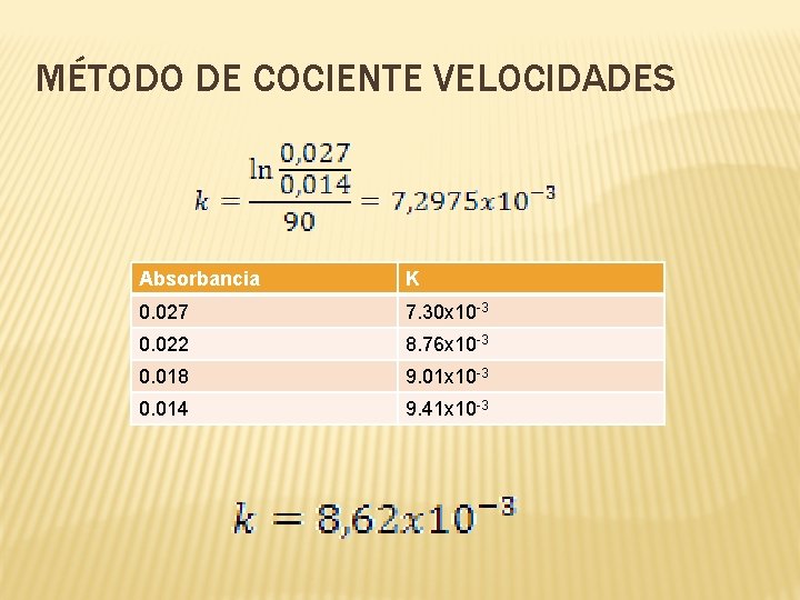 MÉTODO DE COCIENTE VELOCIDADES Absorbancia K 0. 027 7. 30 x 10 -3 0. 022 8. 76 x 10 -3 0. 018 9. 01 x 10 -3 0. 014 9. 41 x 10 -3