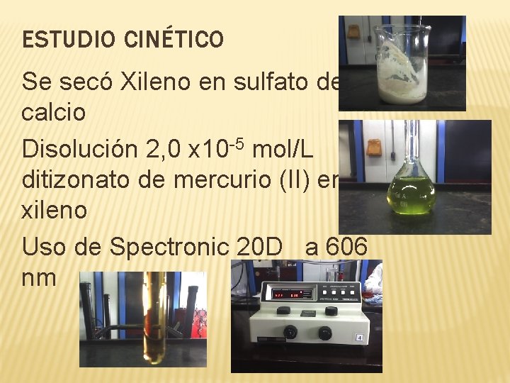ESTUDIO CINÉTICO Se secó Xileno en sulfato de calcio Disolución 2, 0 x 10 -5 mol/L ditizonato de mercurio (II) en xileno Uso de Spectronic 20 D a 606 nm