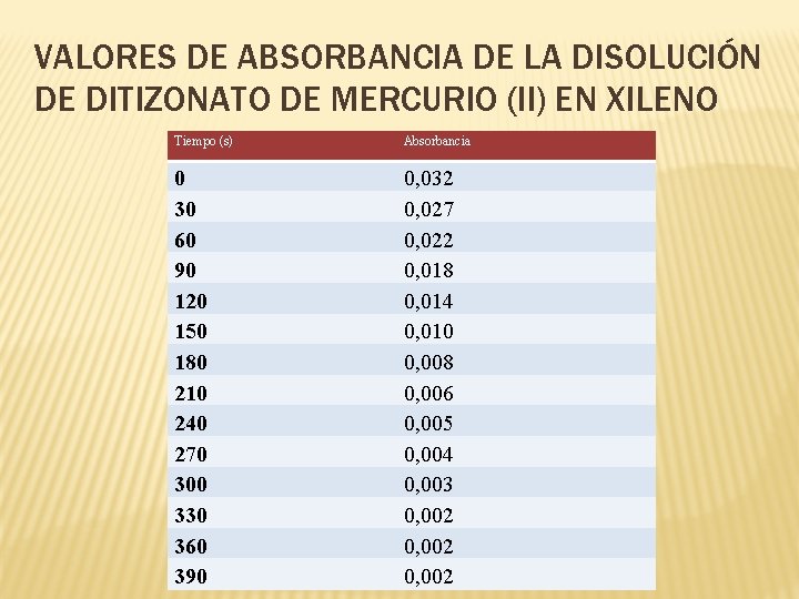 VALORES DE ABSORBANCIA DE LA DISOLUCIÓN DE DITIZONATO DE MERCURIO (II) EN XILENO Tiempo (s) Absorbancia 0 30 60 90 120 150 180 210 240 270 300 330 360 390 0, 032 0, 027 0, 022 0, 018 0, 014 0, 010 0, 008 0, 006 0, 005 0, 004 0, 003 0, 002