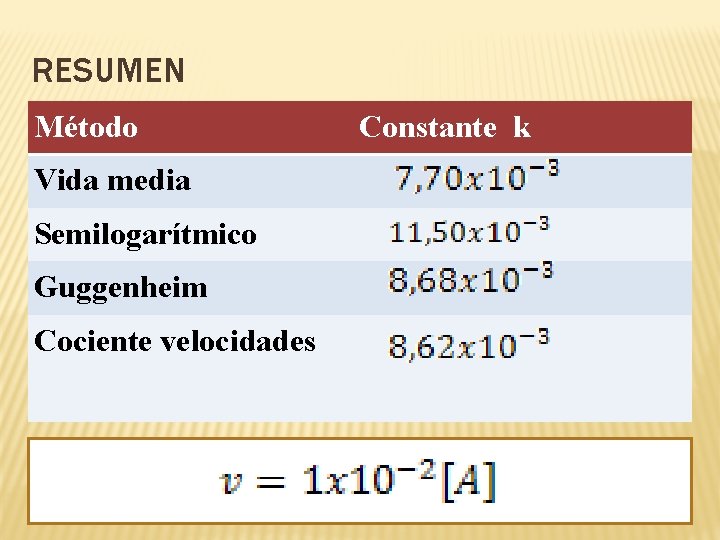 RESUMEN Método Vida media Semilogarítmico Guggenheim Cociente velocidades Constante k