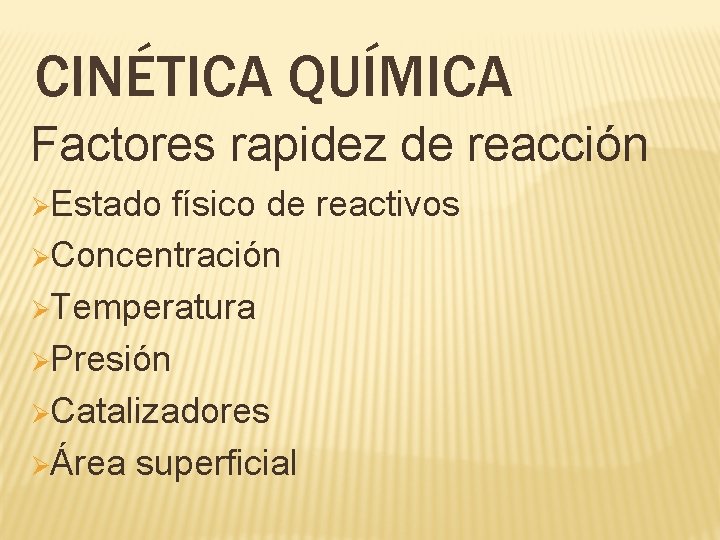 CINÉTICA QUÍMICA Factores rapidez de reacción ØEstado físico de reactivos ØConcentración ØTemperatura ØPresión ØCatalizadores ØÁrea superficial