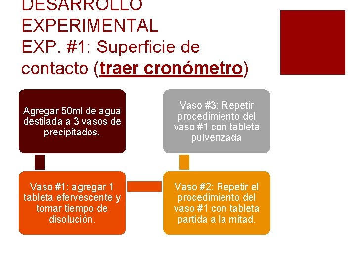 DESARROLLO EXPERIMENTAL EXP. #1: Superficie de contacto (traer cronómetro) Agregar 50 ml de agua destilada a 3 vasos de precipitados. Vaso #3: Repetir procedimiento del vaso #1 con tableta pulverizada Vaso #1: agregar 1 tableta efervescente y tomar tiempo de disolución. Vaso #2: Repetir el procedimiento del vaso #1 con tableta partida a la mitad.
