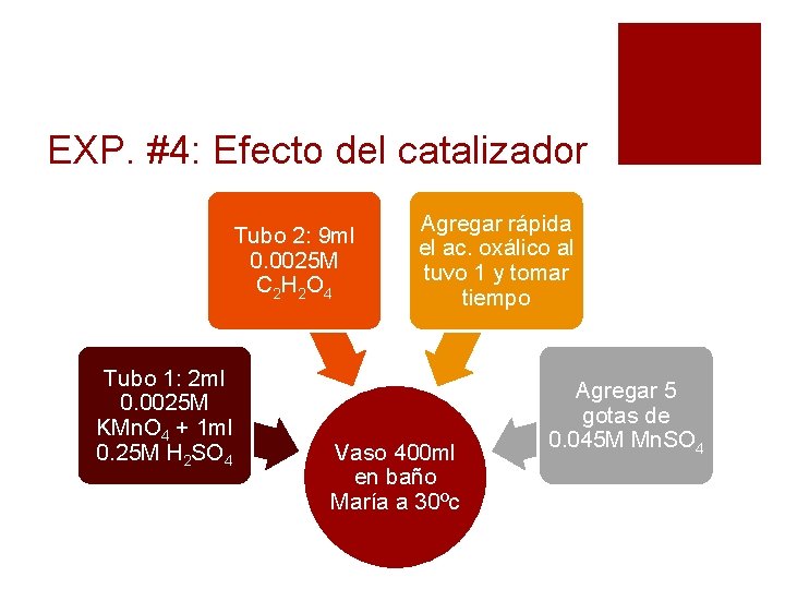 EXP. #4: Efecto del catalizador Tubo 2: 9 ml 0. 0025 M C 2 H 2 O 4 Tubo 1: 2 ml 0. 0025 M KMn. O 4 + 1 ml 0. 25 M H 2 SO 4 Agregar rápida el ac. oxálico al tuvo 1 y tomar tiempo Vaso 400 ml en baño María a 30ºc Agregar 5 gotas de 0. 045 M Mn. SO 4