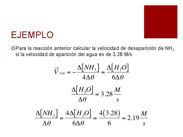 EJEMPLO ¡Para la reacción anterior calcular la velocidad de desaparición de NH 3 si la velocidad de aparición del agua es de 3. 28 M/s
