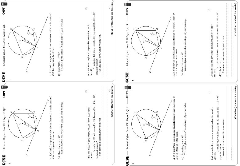 Circle Theorems – Combined – Higher – GCSE Questions These questions are the same format as previous GCSE exams. COPY means they use the exact same numbers as the original GCSE question. Otherwise, they are clone questions using different numbers. The worksheets are provided in a variety of sizes.
