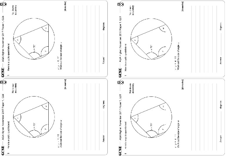 AQA Higher: November 2017 Paper 1, Q 24 1 AQA Higher: November 2017 Paper 1, Q 24 Here is a cyclic quadrilateral. 1 Here is a cyclic quadrilateral. Not drawn accurately [4 marks] Answer degrees