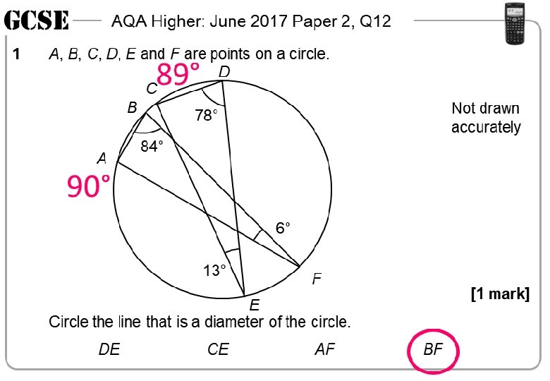 AQA Higher: June 2017 Paper 2, Q 12 1 AQA Higher: June 2017 Paper 2, Q 12 A, B, C, D, E and F are points on a circle. D C B 78° 1 Not drawn accurately 84° A A, B, C, D, E and F are points on a circle. D C B 78° 84° A 6° 13° F [1 mark] E Circle the line that is a diameter of the circle. DE CE AF BF DE 1 Not drawn accurately 84° CE Not drawn accurately 6° 13° F [1 mark] E Circle the line that is a diameter of the circle. CE BF 84° 6° DE AF A, B, C, D, E and F are points on a circle. D C B 78° A 13° [1 mark] AQA Higher: June 2017 Paper 2, Q 12 A, B, C, D, E and F are points on a circle. D C B 78° A F E Circle the line that is a diameter of the circle. AQA Higher: June 2017 Paper 2, Q 12 1 Not drawn accurately AF BF F [1 mark] E Circle the line that is a diameter of the circle. DE CE AF BF