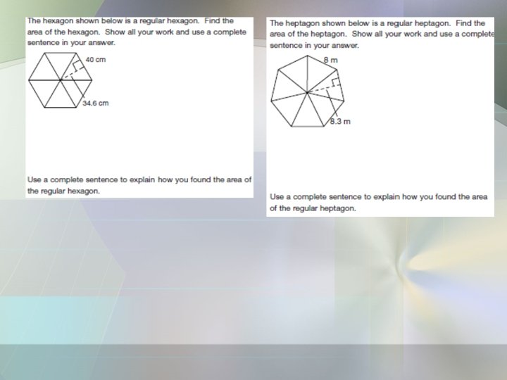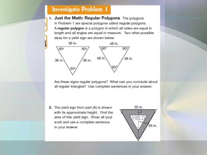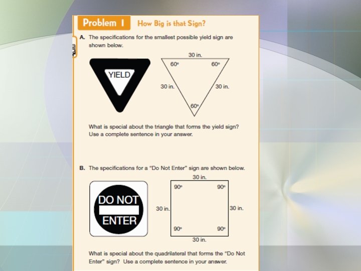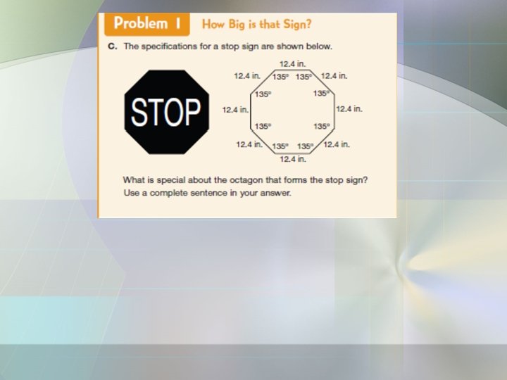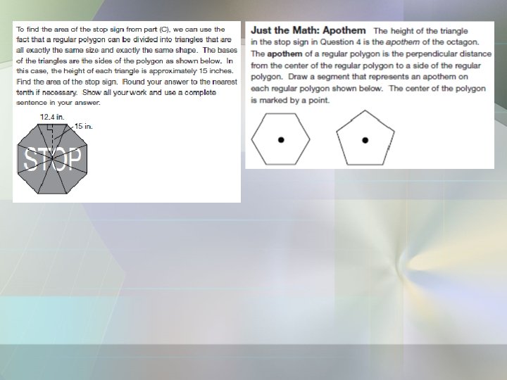 Calculating the area of regular polygons with 5 or more sides • SCENARIO Have you ever noticed that every stop sign looks exactly the same, every yield sign looks exactly the same, and so on? • This is because the Federal Highway Administration has standards that indicate the exact sizes and colors of roadway signs. Most of the sign shapes are polygons.