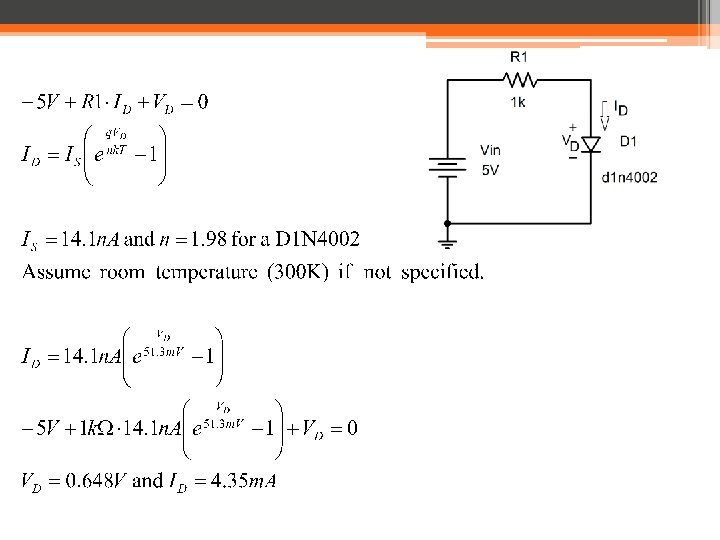 Given: Von = 0. 4 V Rs = 0 W The calculated diode current is positive when the turn-on voltage is 0. 4 V. This is acceptable for the ON model so this model is the correct one to use.