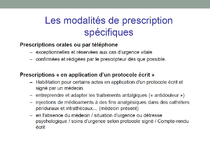 Prescription des médicaments • acte médical se concrétisant par la rédaction d ’une ordonnance • Acte intellectuel et support écrit • Elément du dossier médical • les dentistes, sages-femmes ou vétérinaire peuvent prescrire avec des limites