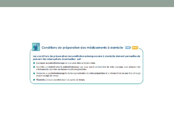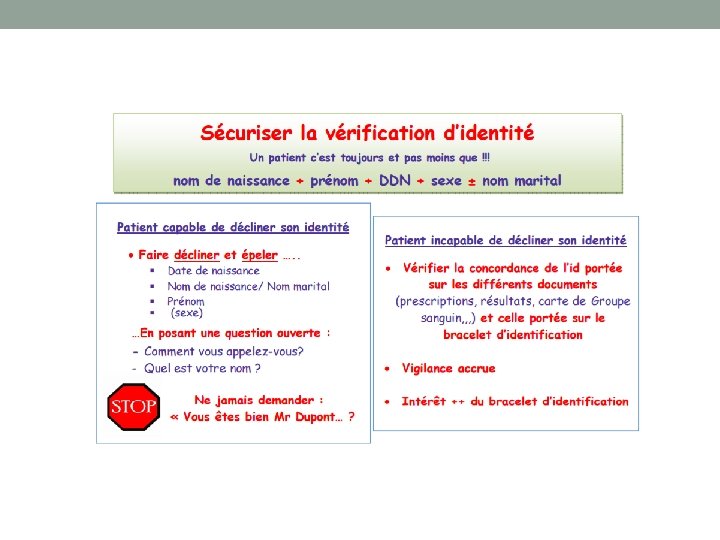 v. Attention à la préparation à l’avance! vÉtiquetage v. Identification des médicaments à risque v. Expliquer au patient, vérifier qu’il a compris v. Tracer l’information ++ v. Protocoles v. Ne pas agir seul dans son coin (travail d’équipe. S) v La sécurisation de ce circuit doit permettre d’éviter les événements indésirables évitables (pour le patient ET pour le personnel)