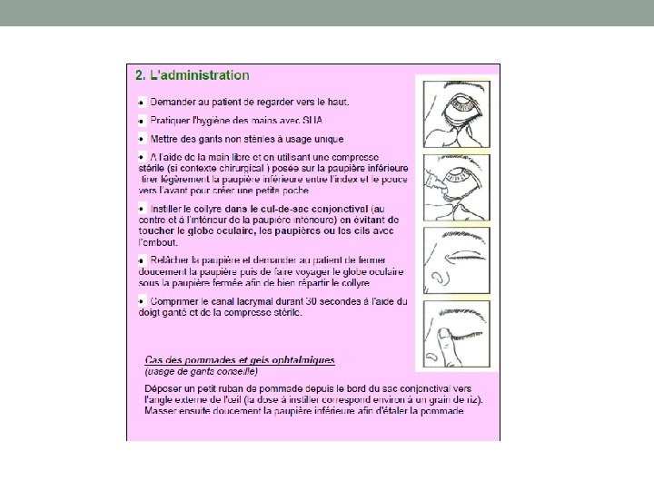 • Le médicament • – Nom, forme et dosage du médicament, Attention aux équivalences Confirmation du prescripteur en cas de doute • – Voie d ’administration (voie IM, IVD ou perf IV) • – Heure et fréquence d’administration • – Date de péremption • – Aspect macroscopique du médicament (limpidité, etc)