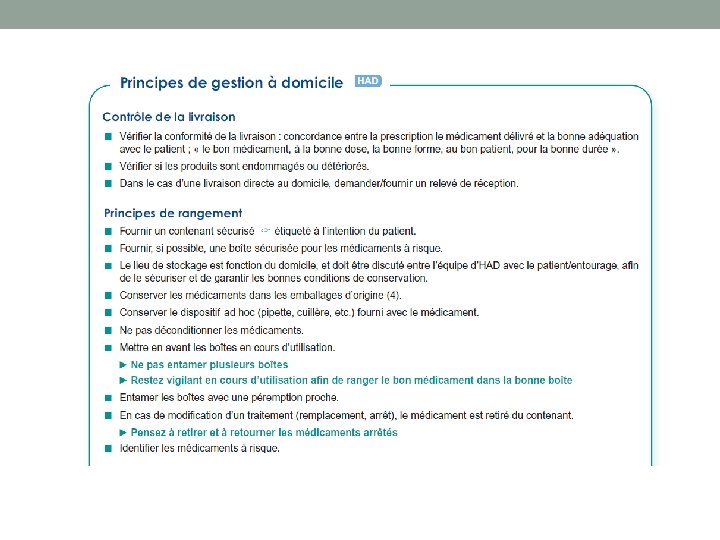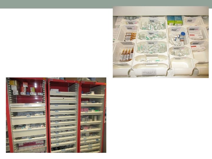 • 1. Conditionnement unitaire : à favoriser car il permet l’identification du médicament jusqu’au lit du malade par l’infirmièr(e). • 2. Distribution des médicaments aux unités de soins • Distribution globale : commande de médicaments sans ordonnances • Distribution globalisée : regroupement de plusieurs ordonnances • Délivrance nominative : pour un patient pour une période • 3. « Armoire à pharmacie » : Chaque unité de soins dispose d’un stock de médicaments appelé dotation pour besoins urgents pour satisfaire les situations courantes. • 4. Traitement personnel : Lorsqu’un patient est hospitalisé, il doit remettre ses médicaments au personnel de soins afin d’éviter toute confusion ou surdosage volontaire ou non.