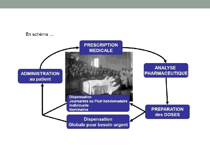 Circuit du médicament à l’hôpital • -Le circuit du médicament est une succession d’étapes réalisées par des professionnels de santé différents. • -Ces professionnels agissent en collaboration étroite avec la direction de l’hôpital pour organiser ce circuit. • -L’organisation de ce circuit a pour but d’améliorer la prise en charge du patient (tant au niveau de la sécurité que de l’efficacité du traitement).