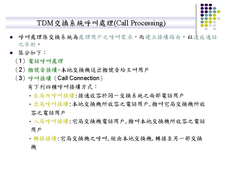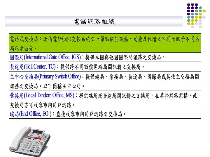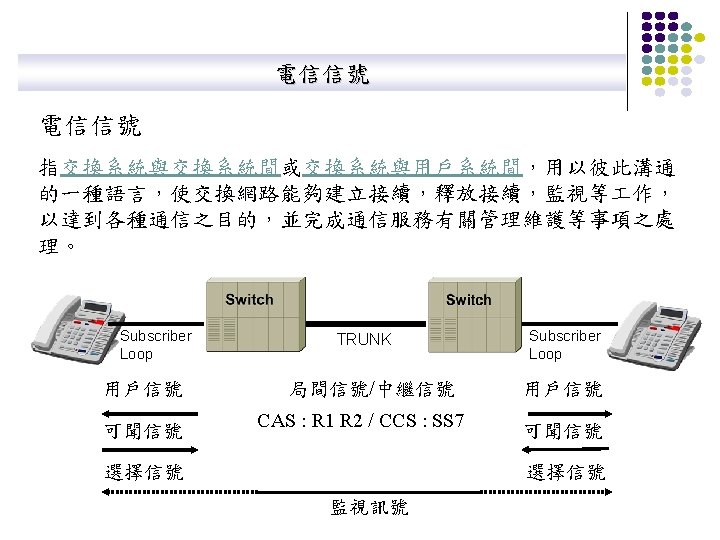 電話網路組織階層圖 Packet. Star TM Voice Gateway 台北長途局 Packet. Star TM Voice Gateway 台中長途局 Packet. Star TM Voice Gateway Packet. Star 彙接局甲 TM 高雄長途局 Voice Gateway Packet. Star 彙接局乙 用戶甲 用戶乙 Voice Gateway 彙接局丙 市話局乙 市話局甲 TM 市話局丙 用戶丙