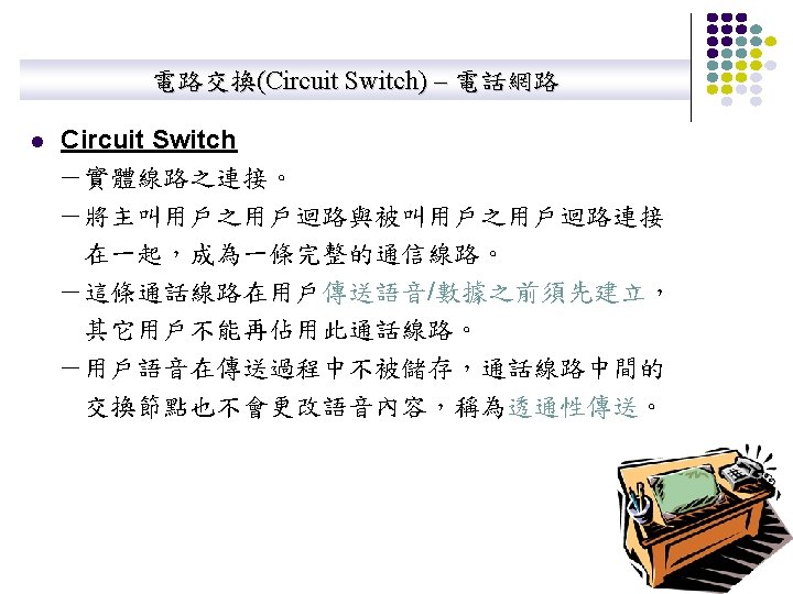 Circuit Switches The Telephone Network Signaling Traffic and Overload Control in Telephone Networks 學號:M 9308383 座號: 9 姓名:盧相平 指導教授:陳明仕 教授 2005. 04. 27.