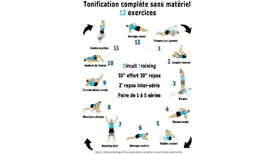 Objectifs à tenir selon sa condition physique Je suis débutant, pas trop en forme physique 1. 2 séances par semaine 2. 30 secondes d'effort 45 secondes de récupération, 3. 1 seule série des 12 exercices J’ai l’habitude de l’effort physique 1. 3 séances par semaine 2. 30 secondes d'effort 30 secondes de récupération, 3. 3 séries des 12 exercices