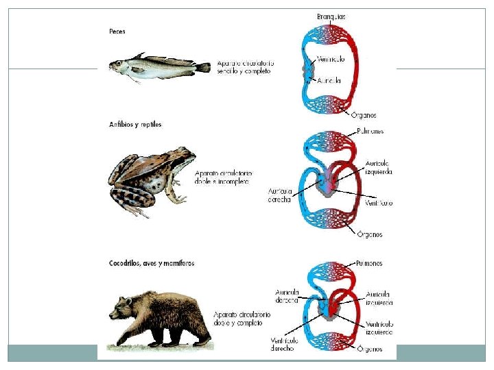 TIPOS DE CIRCULACION DOBLE 2. 1 Doble incompleta: Es cuando solo hay 1 solo ventrículo, permitiendo que la sangre con oxígeno y la sangre con CO 2 parcialmente se mezclen. Ocurre en anfibios y reptiles excepto en el cocodrilo. 2. 2 Doble completa: Cuando la sangre con oxigeno no se mezcla con la sangre pobre en oxigeno. Hay 2 ventrículos Ocurren en cocodrilos, aves y mamífero