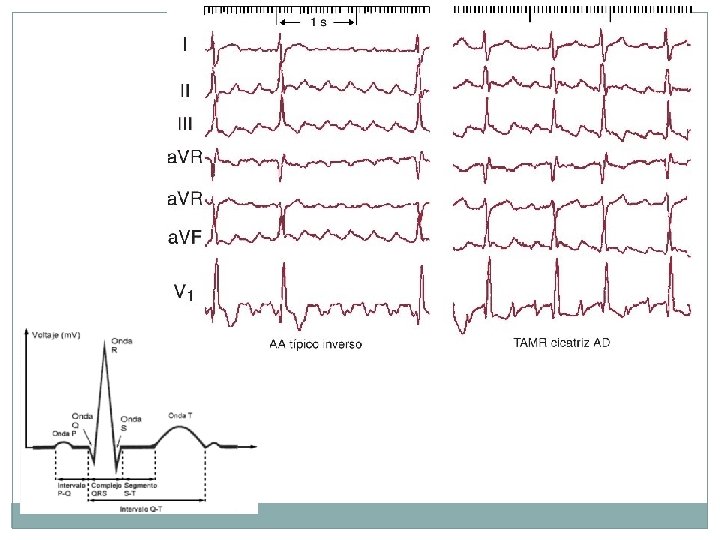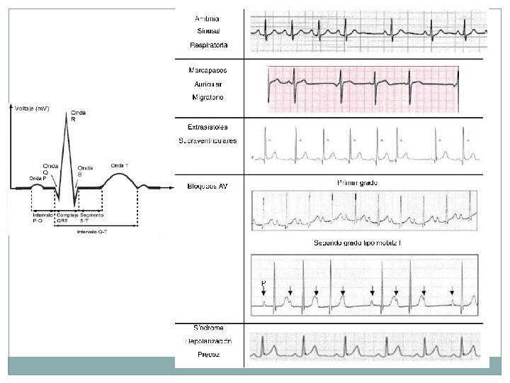 Electrocardiograma ECG Cada onda representa la corriente eléctrica en un área determinada del corazón: - Onda P: muestra las contracciones de las aurículas. - Complejo QRS: indica las contracciones de los ventrículos. - Onda T: enseña cómo se relajan (periodo de recuperación eléctrica) los ventrículos.