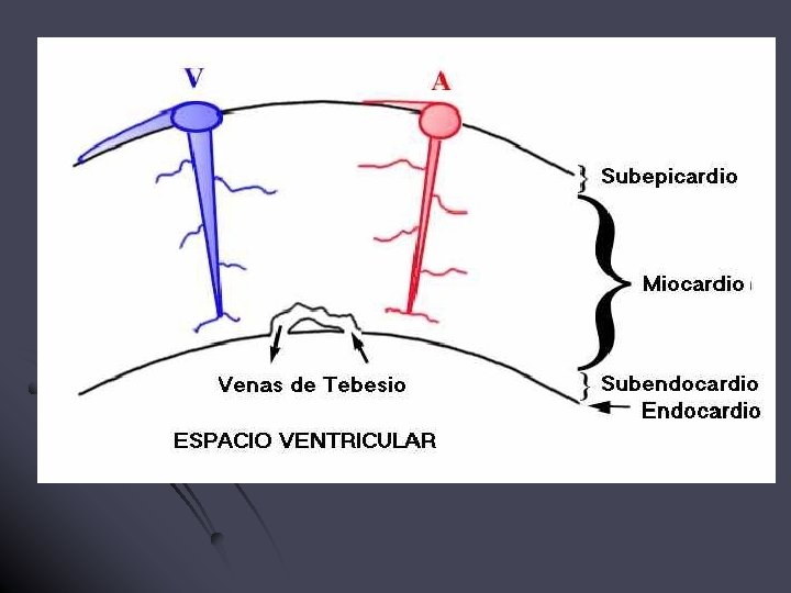Anatomia de la circulacion coronaria l Tiene la pared ventricular dividida en 4 regiones: l l Subepicardio: compuesto por la superficie de los vasos epicárdicos, nervios, tejido conectivo y tejido adiposo. Miocardio: Es la capa muscular Subendocardio: compuesto de tejido conectivo, venas de tebesio (canales ramificados que conectan con el ventrículo y ayudan a transportan la sangre oxigenada a la parte interna de las paredes) y de las fibras de purkinje. Endocardio: compuesto por una sola capa de células endoteliales