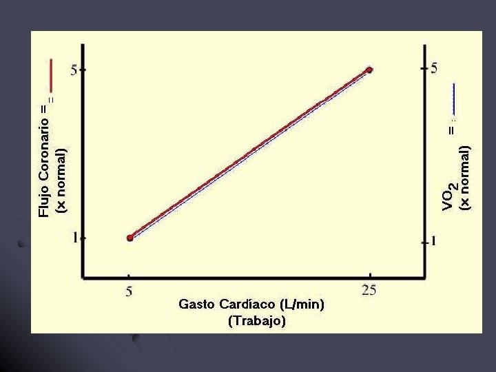 Control de la Resistencia Vascular coronaria y el flujo sanguineo l Metabolismo intrínseco: Mejor mecanismo para asegurar un alto acoplamiento entre flujo, VO 2 y GC, el cual se incrementa en 5 veces. l Esto permite excelente flujo autorregulable a nivel de la circulación coronaria en caso de cambios súbitos en la presión arterial. l Control miogénico l El Oxido nítrico ejerce una ligera dilatación en la resistencia de los vasos.