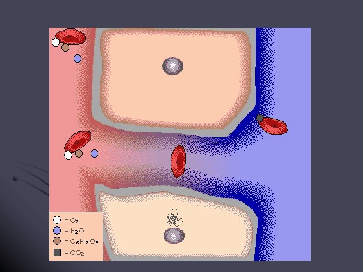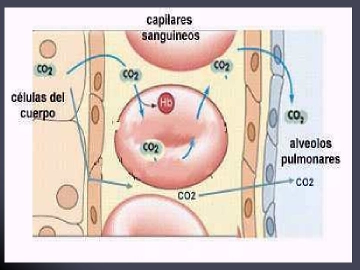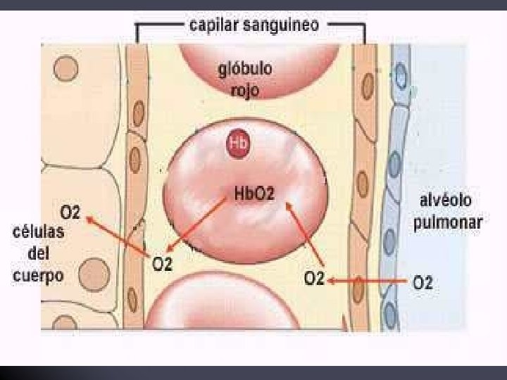 Entrada de O 2 Salida de CO 2 Alveolos Traquea Arterias pulmonares Venas pulmonares Bronquios Corazón Arteria Pulmones Vena Capilares Tejido celular Paredes capilares