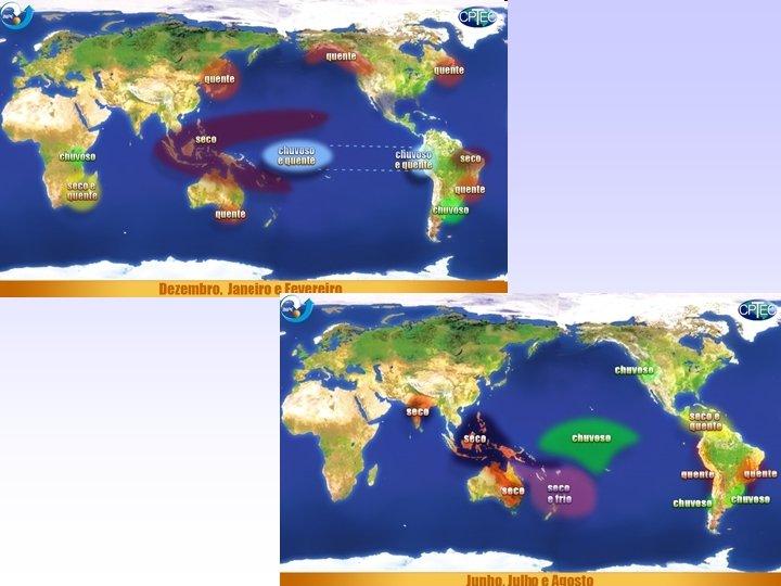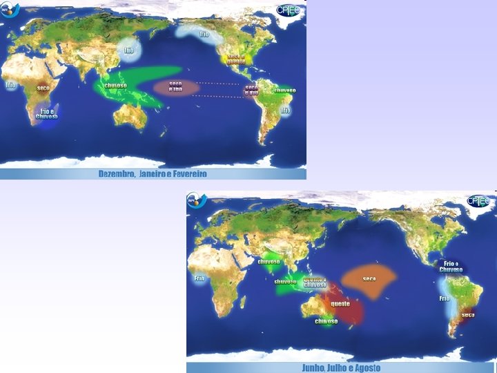 O CLIMA DO BRASIL – TSM NO OCEANO PACÍFICO TROPICAL • Anomalia de TSM: La Niña 1988 -89 e El Niño 1997 -98. Fonte: Amaro e Molion, 2008. Desvios de precipitação em cm/mês: La Niña 1988 -89 e El Niño 199798. Fonte: Amaro e Molion, 2008. (verde: negativo; azul: positivo)