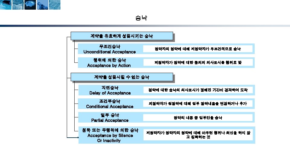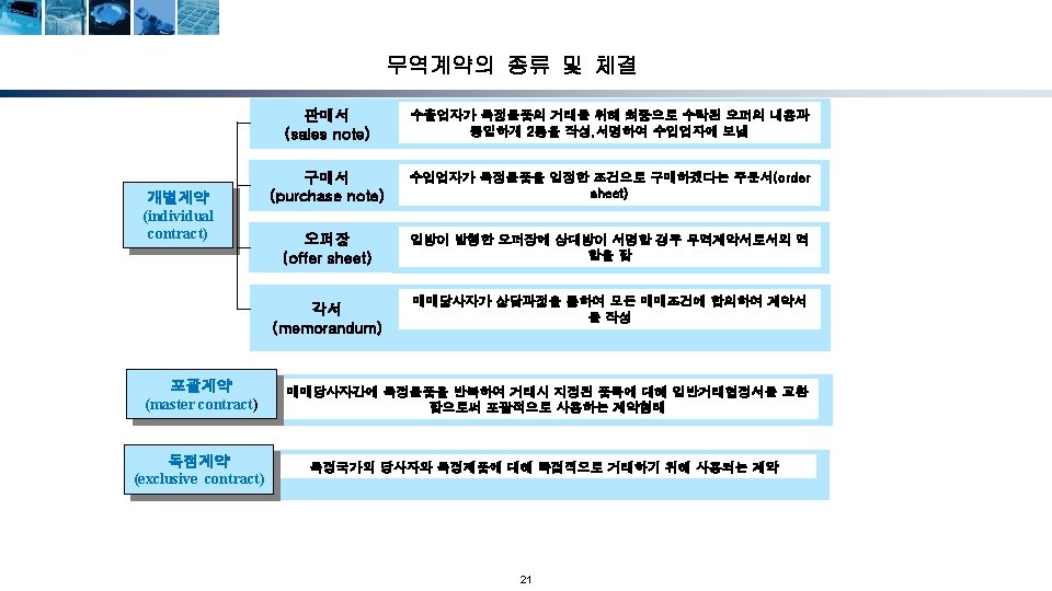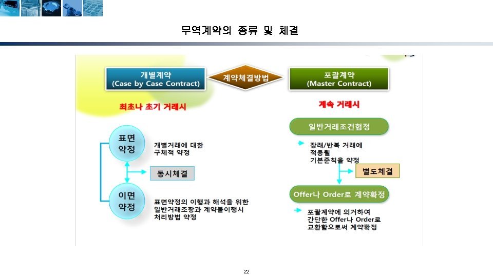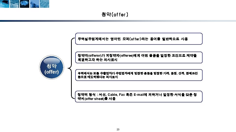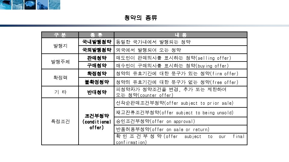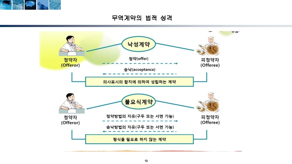 무역계약의 성립단계 청약자 (Offeror) 해외시장조사 및 거래선 발굴 거래권유(circular letter) 피청약자 (Offeree) 조회(trade inquiry) 조회회신 및 신용조회 Reply to inquiry and credit inquiry 청약(offer) 매도인 (Seller) 반대청약(counter offer) 승낙(acceptance) 계약성립(acceptance) Formation of contract) 17 매수인 (Buyer)