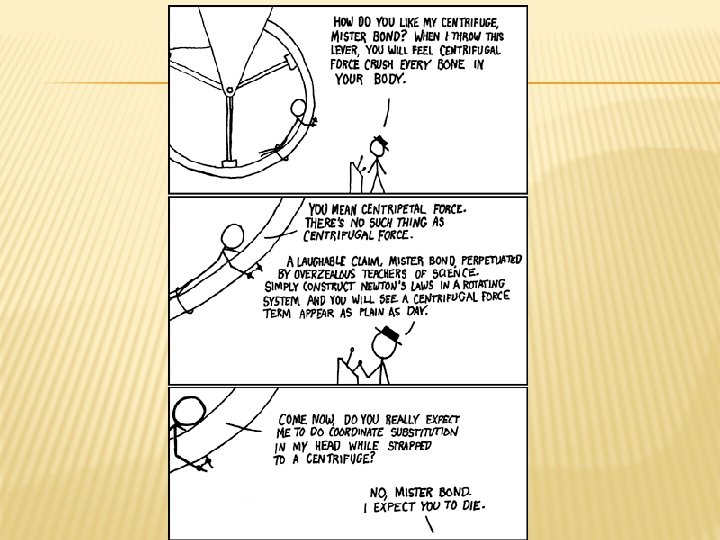 THE GREAT MISCONCEPTION � Centrifugal, not to be confused with centripetal, means away from the center or outward. � Circular motion leaves the moving person with the sensation of being thrown OUTWARD from the center of the circle rather than INWARD � It’s really just inertia! � http: //www. physicsclassroom. com/mmedia/ci rcmot/cf. cfm