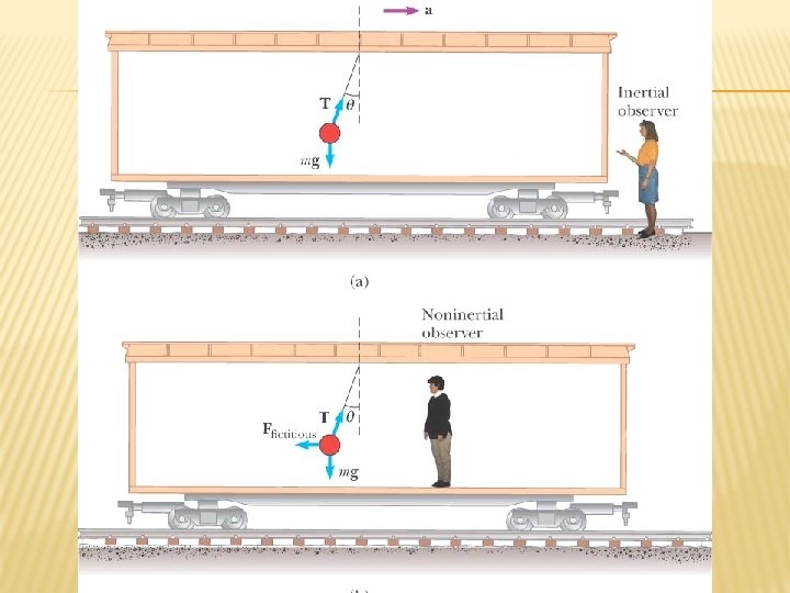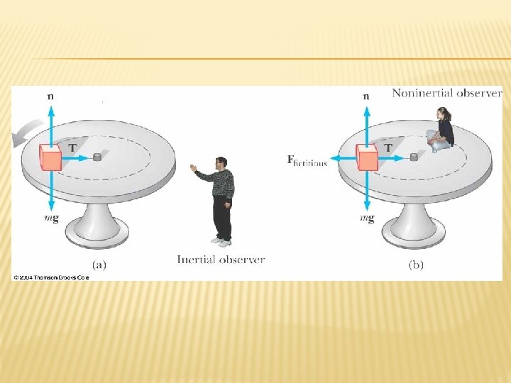 FICTIONAL FORCES � From the frame of the passenger (b), a force appears to push her toward the door � From the frame of the Earth, the car applies a leftward force on the passenger � The outward force is often called a centrifugal force � It is a fictitious force due to the acceleration associated with the car’s change in direction