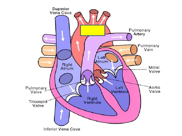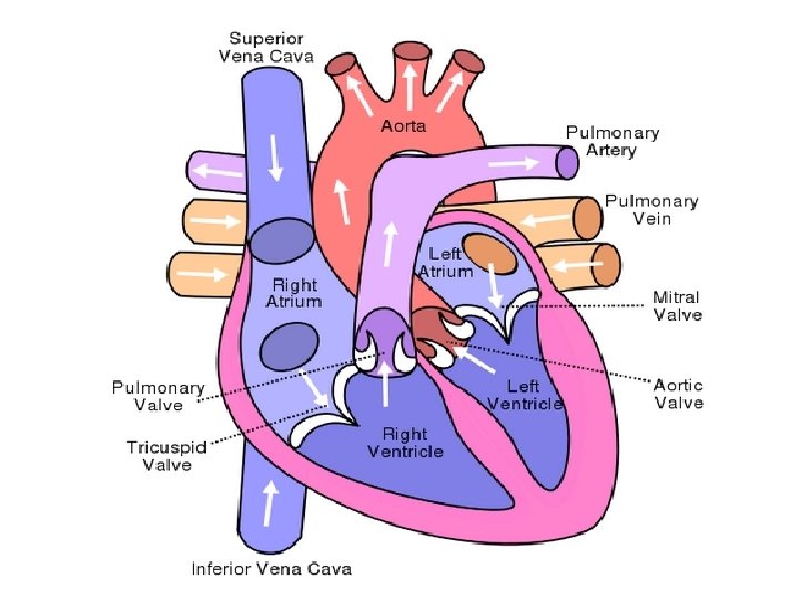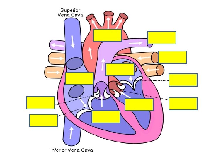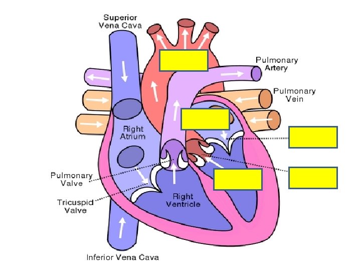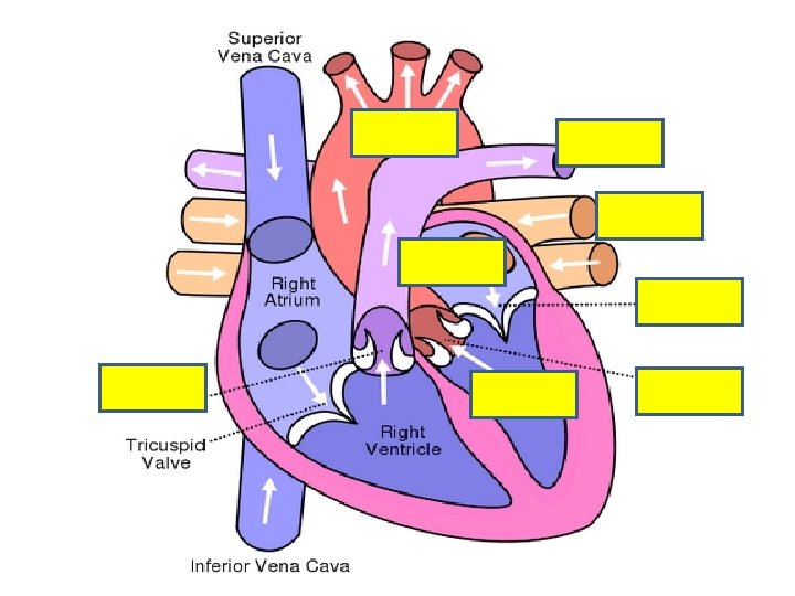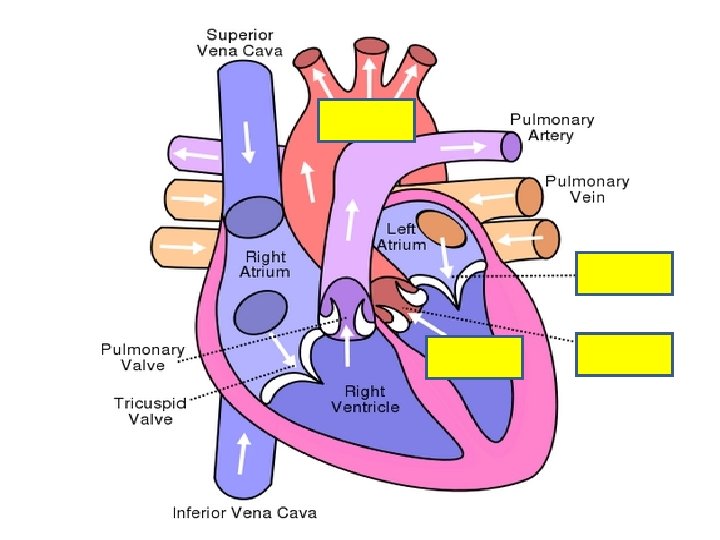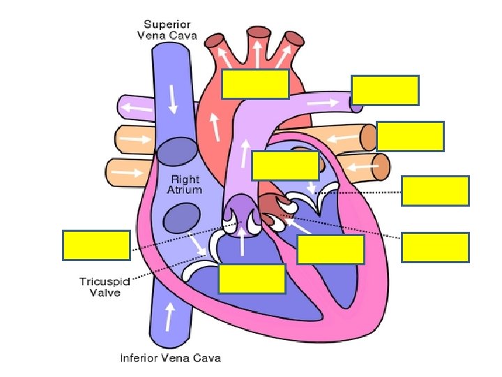 Blood Flow through the Heart • Deoxygenated blood from the body enters the inferior right atrium _______via the _____and superior vena cava ___________. • Here the blood is passed through the right ventricle tricuspid valve _______to the ________.