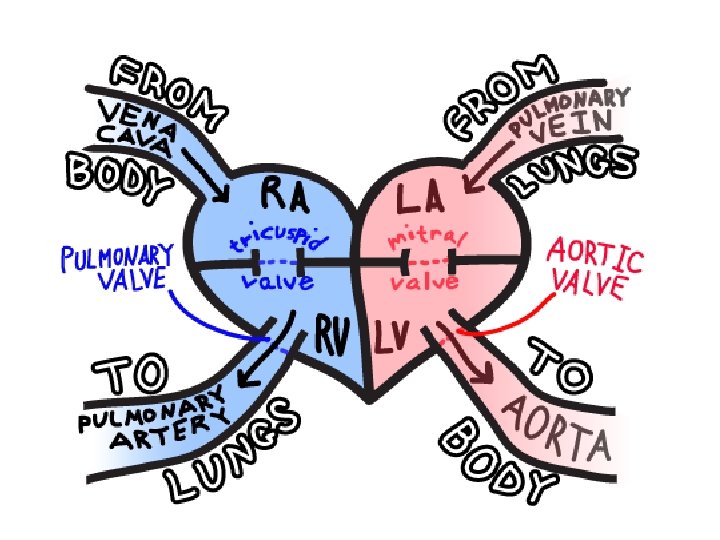 • Oxygenated blood from the lungs returns to pulmonary the heart via the left and right ______ left atrium veins to the ______. left ventricle • The blood is passed to the _______ bicuspid through the _____ valve. • The left ventricle contracts and pushes blood through the semilunar valves and out through aorta the _______ to the body.