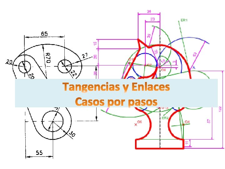 Caso 22: Trazar circunferencias o enlaces tangentes a una circunferencia y a una recta dado un punto A en la circunferencia O 2 O A O 1 4. Los puntos donde las bisectrices cortan a la recta AO son los centros O 1 Y O 2 de dos circunferencias 1 Unir centro de la circunferencia O con A y prolongar. tangentes a lael recta y a la circunferencia en A. 3. Hallar laspunto bisectrices de los ángulos que tangente forma la recta en el paso 1 con la recta dada. . 2. Por el A trazar una recta a lahallada circunferencia y prolongarla