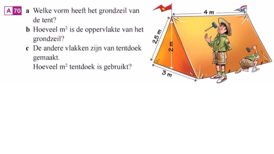 70 a) b) c) Rechthoek 3 x 4 = 12 m 2 2, 5 x 4 x 2 = 20 m 2 0, 5 x 3 x 2 = 2, 5 m x 2 2, 5 m 2 m 4 m 3 m x 2