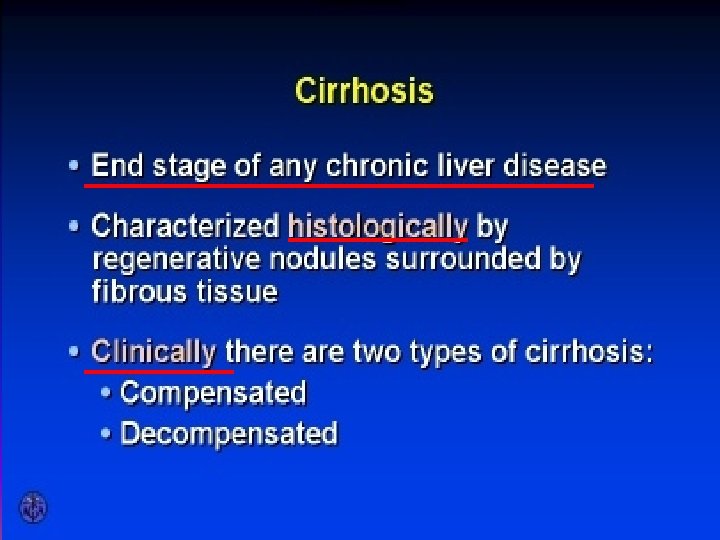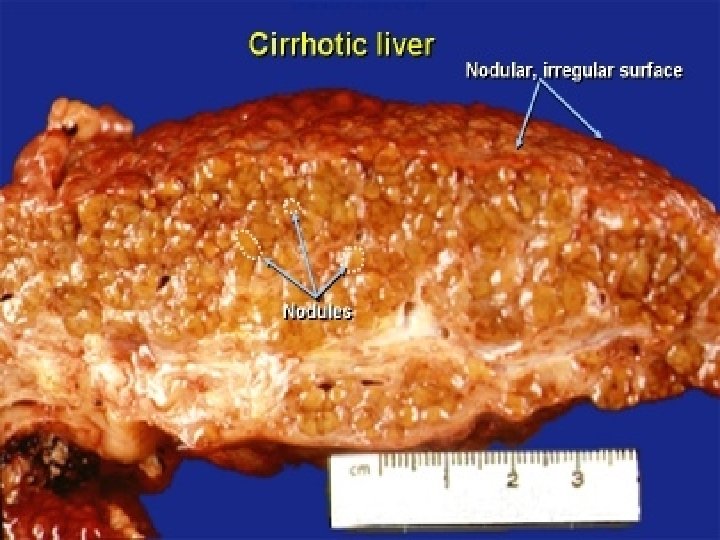 Cirrhosis Definition: Hepatic necrosis and degeneration combined with hepatic regeneration and fibrosis leading to Nodular formation