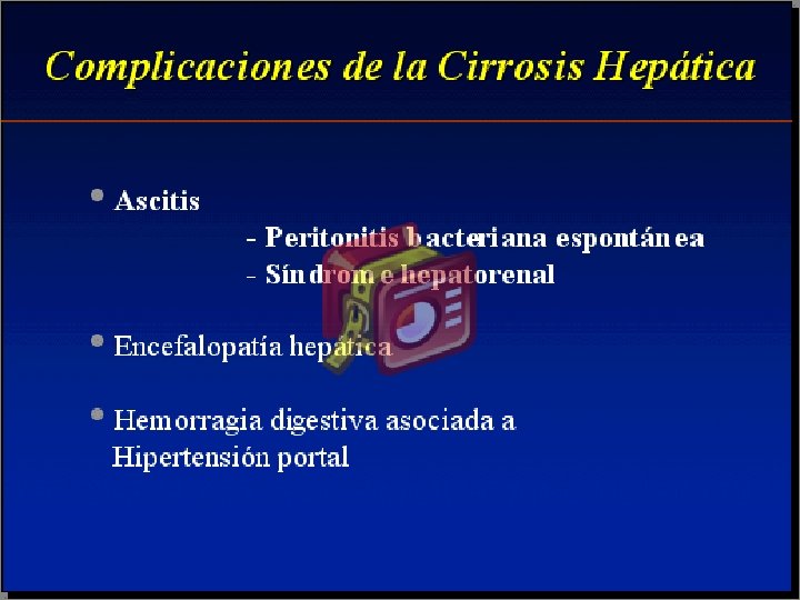 Factores Precipitantes de descompensación l l l l Consumo de alcohol Uso de sedante Infección intercurrente Ingesta excesiva de proteínas Hemorragia digestiva Constipación El uso inadecuado de diuréticos El desarrollo de un cáncer hepático o de una trombosis portal.
