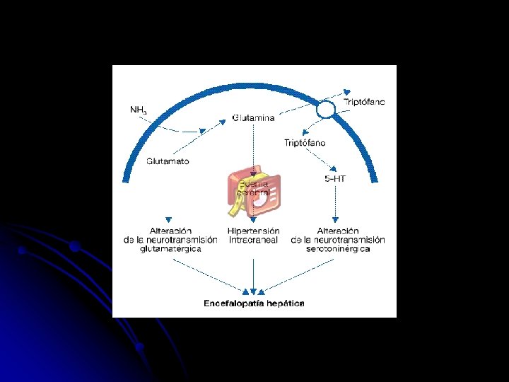 Encefalopatía Hepática l l l Trastorno neurológico, inicialmente reversible, sin localización El origen de la encefalopatía está relacionado al metabolismo de compuestos nitrogenados en el tubo digestivo, al eludir el paso por el hígado, gracias a la presencia de los shunt En la génesis de la encefalopatía portal existen 4 hipótesis dominantes: a) Neurotoxicidad del amonio l b) Acción sinérgica entre mercaptanos y amonio l c) Falsos neurotransmisores l d) Inhibición de la neurotransmisión l