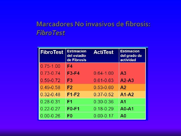 ¨ Utiliza 5 marcadores bioquímicos del suero para predecir la fibrosis. – – – ¨ ¨ Alfa -2 macroglobulina. Haptoglobina. Gama-glutamil transpeptidasa. Bilirrubina total. Apolipoproteina A 1. Marcadores de inflamación NO de fibrosis. En la HVC crónica, inflamación es paralela a la fibrosis. Puede diferenciar etapas de fibrosis 0 -1 de 2 -4. 8 estudios AUROC 0, 75 -0, 85 para diferenciar F 0 -F 1 v. s. F 2, F 3, F 4